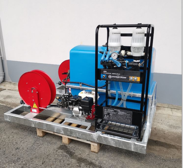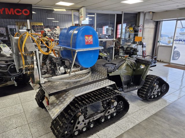 Ce pulvérisateur est équipée d'une cuve de 400 l en polyester, ainsi que d'un moto-pompe thermique. Il est accompagné de 2 enrouleurs disposant de 100 m de tuyau et un système de dosage.